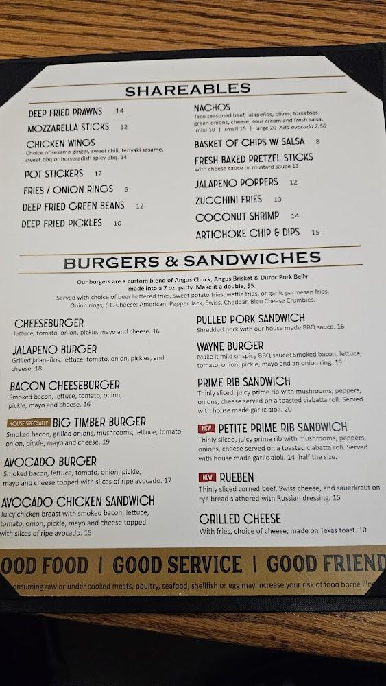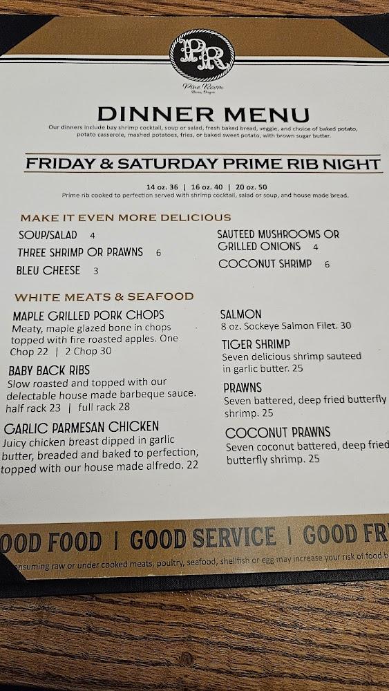 The Pine Room's menu reflects classic American cuisine with a twist. Start with fun appetizers like deep-fried prawns or nachos before moving on to main dishes. Their burgers are popular, especially the bacon cheeseburger and pulled pork sandwich. The steak selection impresses, with options like T-bone and New York cuts.